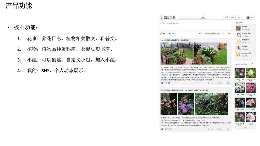 需求场景:为花友提供 植物品种库、花事记录、小组讨论、园艺手册、个人主页 等产品模块。